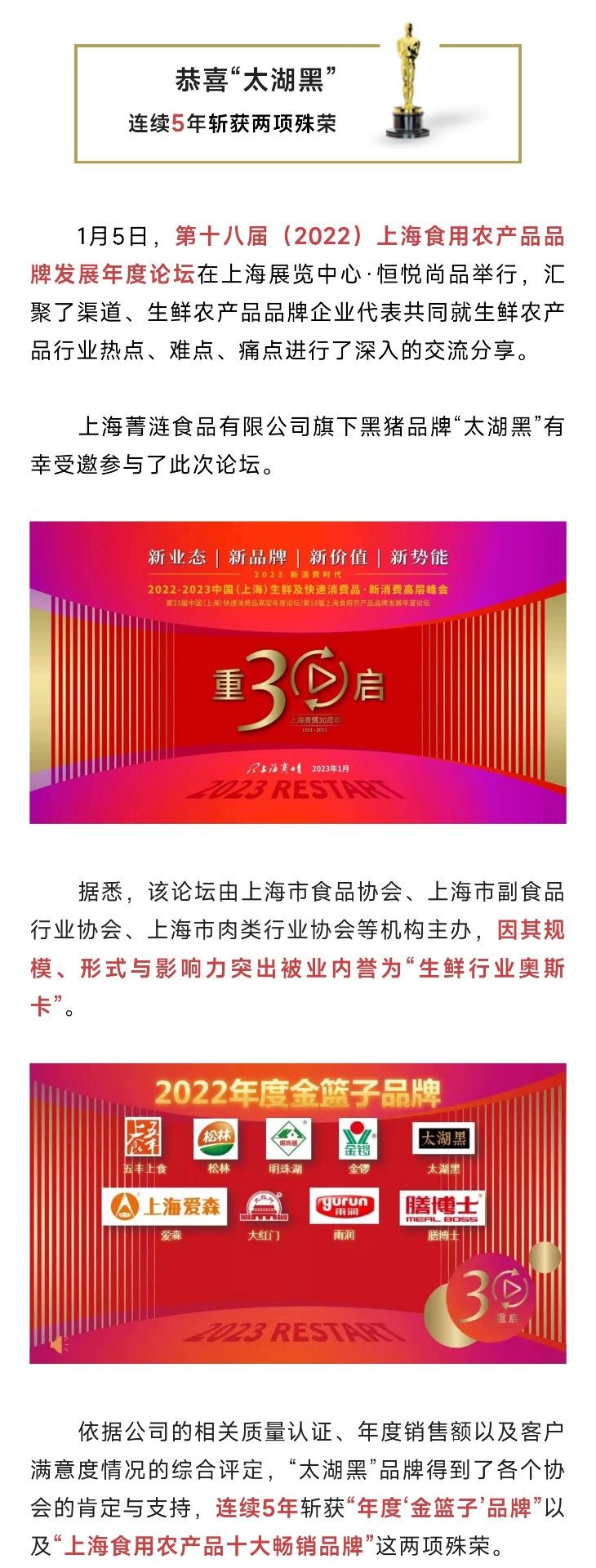生鮮行業“奧斯卡”頒獎!太湖黑連續5年榮獲兩項殊榮!